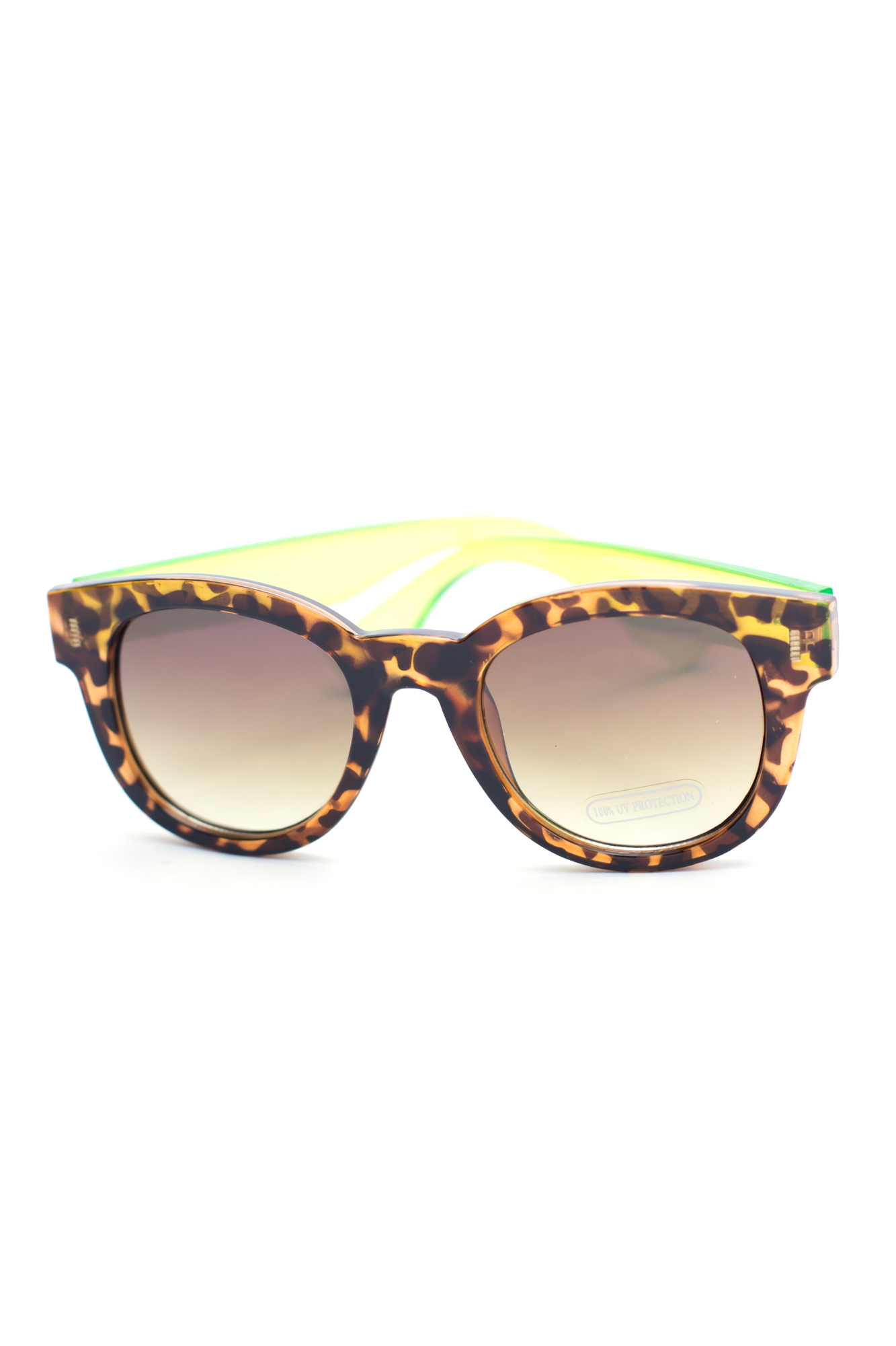 Tortoise Shell Cat Eye Sunglasses $8.00 Cat eye sunglasses with tortoise shell design and neon green arms. Tweet